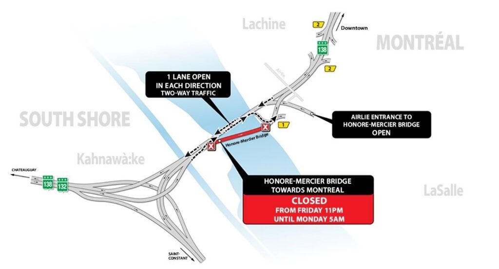 The Mohawk Council of Kahnawà:ke (MCK) has been informed by the Ministère des Transports du Québec that repair work on the Mercier Bridge will take place tonight, Friday, October 24th, from 11pm until Monday, October 27th at 5am. One (1) lane will be available in each direction (counter-flow traffic configuration) on the Kahnawake bound side of the span.